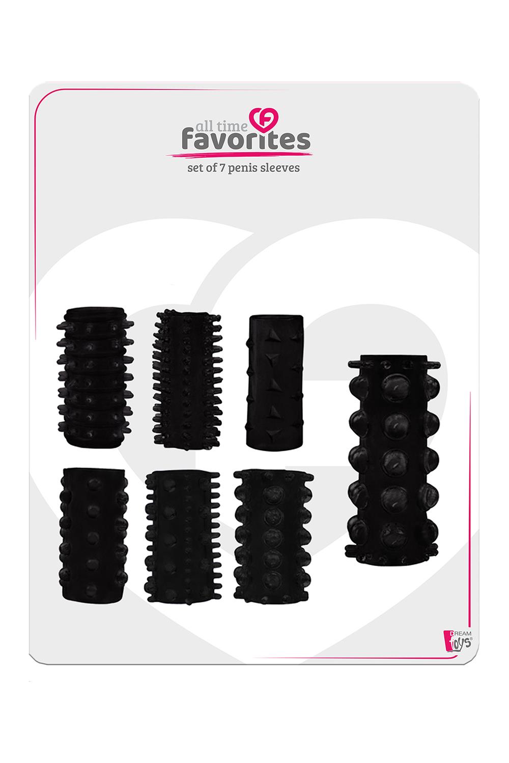 This set of 7 penis sleeves from the All Time Favorites label features 7 different textures. They are stretchy and because of their tight fit they work as a penis ring for harder and longer lasting erections, while the texture stimulates her during intercourse. 7 Penis sleeves.Various textures. Stretchy. Tight fit for hard and long-lasting erections.