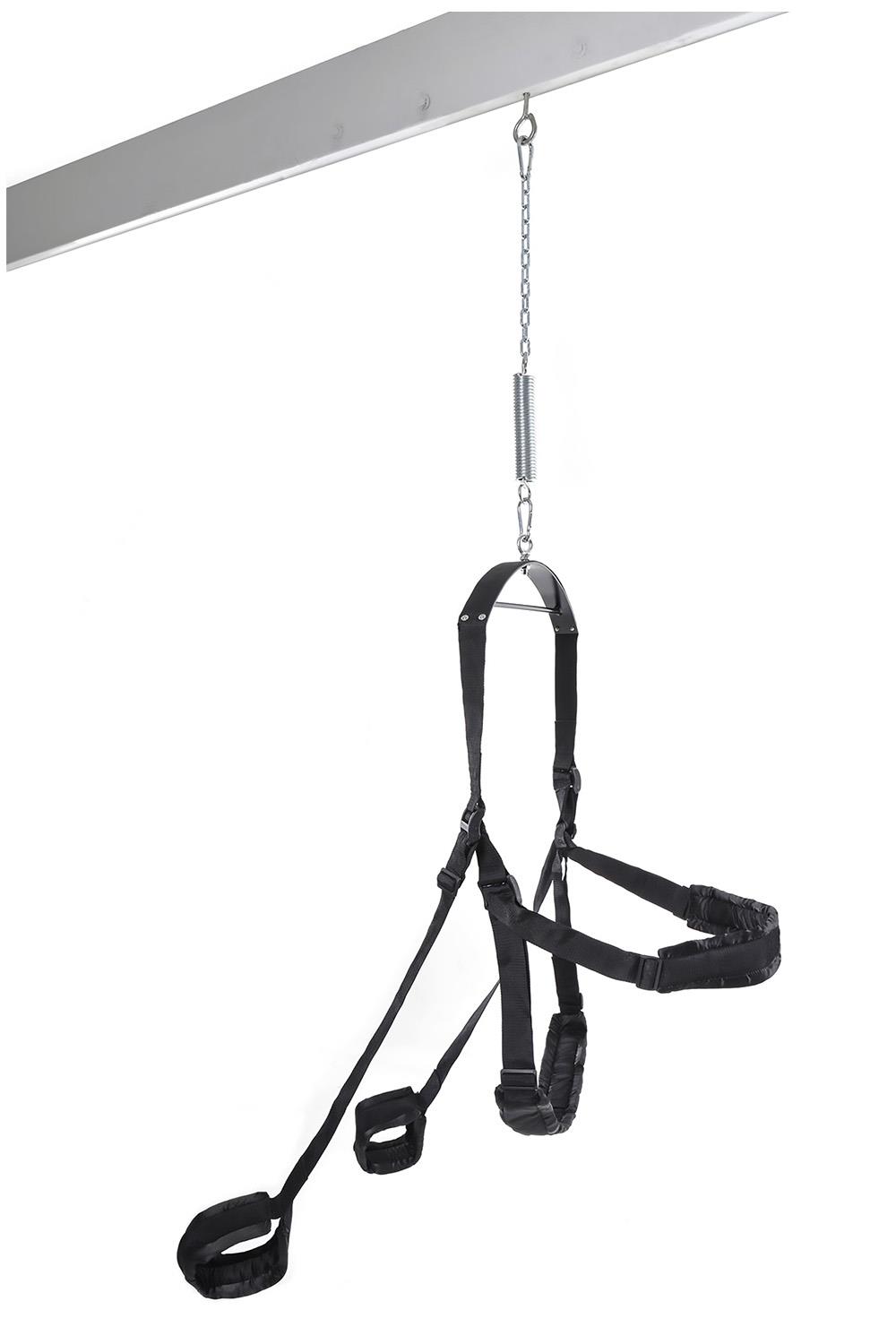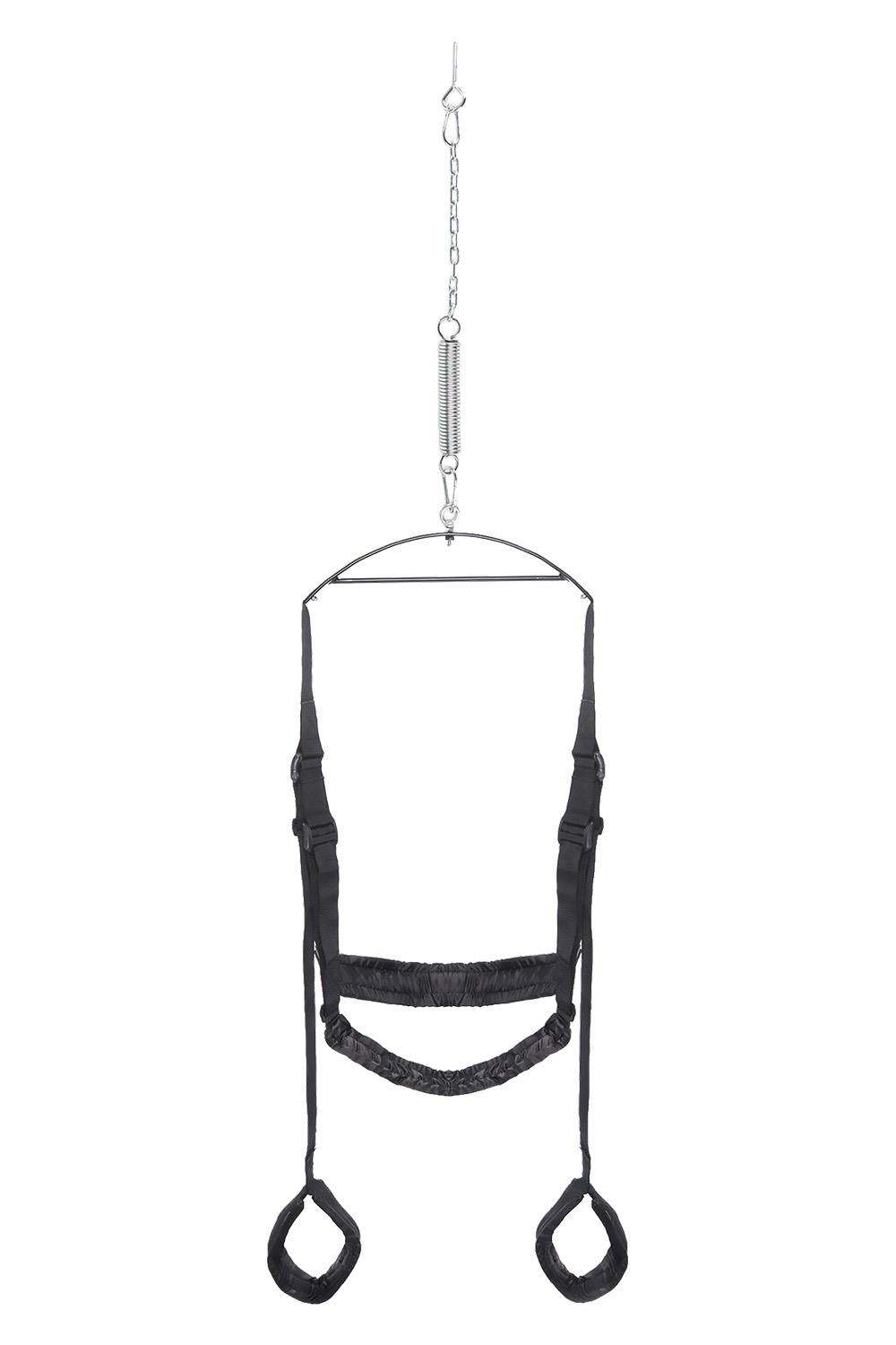 With the incredible Fantasy Swing® you’ll be swinging your sex life back into action in no time at all! Installation is quick and easy and requires only a few common tools. Includes: Heavy-Duty Steel Eyelet Bolt Heavy-Duty Link Chain Torsion Spring Metal Support Bar 2 Large Padded Supports for Butt and Back 2 Small Padded Stirrups for Legs 2 EZ-Open Connecting Hooks Instruction Sheet INSTRUCTIONS: The eyelet bolt of the Fantasy Swing® can be installed in two places: into the underside wooden frame of a doorway, or into a beam in the ceiling. Installing the eyelet bolt into a doorframe is easiest, but the doorway limits your range of motion. Installing the eyelet bolt into a strong ceiling beam is the preferred method of use. Please follow both sets of instructions carefully to ensure a safe and enjoyable Fantasy Swing‚® experience. FOR DOORWAYS: Locate the center of the wooden doorway and mark a spot on the underside of the doorframe. The eyelet bolt is very sharp and can be screwed in by tapping the head of the bolt with a hammer and twisting the screw until all of the threads are concealed. Use the hammer claw to help turn the eyelet bolt into the wood. To facilitate insertion, drill a 5/16 pilot hole first, then screw the eyelet bolt in. All of the threads should be concealed. FOR CEILINGS: Locate a beam in your ceiling using a stud finder, available from any hardware store. Make sure you have enough clearance from any surrounding walls or furniture. Find the center of the beam and mark a spot. The eyelet bolt is very sharp and can be screwed in by tapping the head of the bolt with a hammer and twisting the screw until all of the threads are concealed. Use the hammer claw to help turn the eyelet screw into the wood. To facilitate insertion, drill a 5/16 pilot hole first, then screw the eyelet bolt in. All of the threads should be concealed. CAUTION: Once the eyelet bolt is installed, do not remove it for safety purposes. Doing so could weaken the eyelet bolt hold! HANGING THE SWING: If the weight on the swing is less than 200 lbs., use the Torsion Spring provided If the weight on the swing is over 200 lbs., assemble the swing hardware without the use of a spring. During two-person usage, make sure to account for the position of both partners when determining the weight (one partner may be on the floor, not actually hanging from the spring). WARNING: If using Torsion Spring, avoid putting hands on or near spring while using the Fantasy Swing®. Your fingers or other body parts may get pinched if too close! The Fantasy Swing® is fully adjustable and designed for your comfort. All pads, supports, and stirrups can be adjusted to accommodate a variety of sexual positions with minimal exertion. The hardware for the swing can also be adjusted to hang the swing any distance from the floor. Use your imagination and have fun! WARNING: Suggested weight limit not to exceed 350 lbs. Install and use at your own risk.
