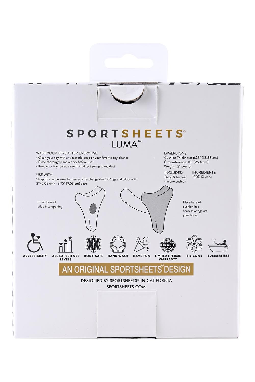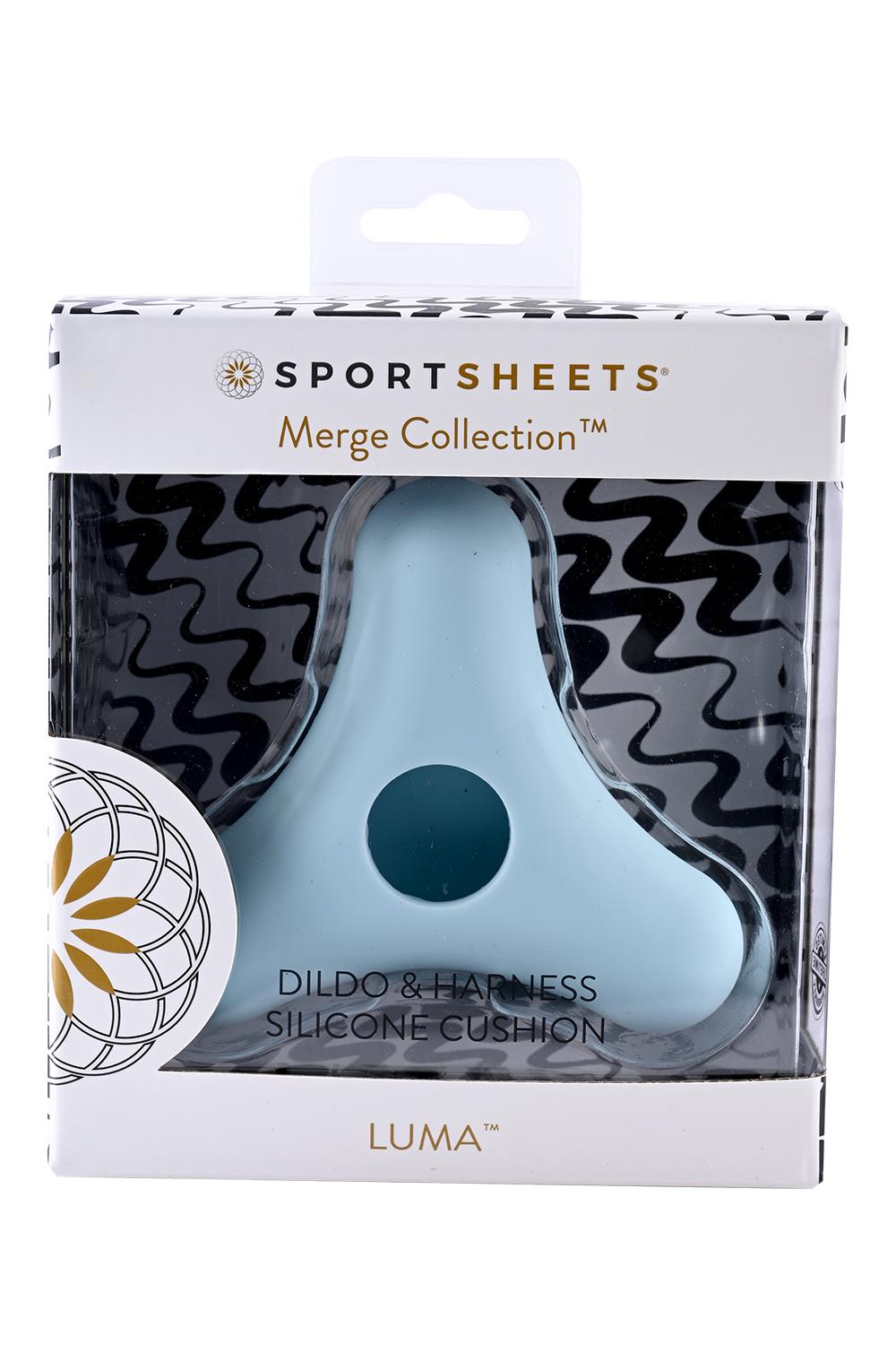 The Sportsheets® Merge Collection’s® LUMA Dildo and Harness Cushion is a smooth, silicone sleeve that stretches easily over the base of dildos measuring 2 to 3.75″. The squishy sky-blue accessory helps stabilize your dildo while in a harness, enhances comfort for the harness wearer and reduces pubic bruising. The triangle shaped LUMA can be paired with O Ring and Underwear style harnesses to add extra cushion during thrusting. It’s the perfect cushion for all your pushin’!Use with Strap Ons, underwear harnesses, interchangeable O Rings, and dildos with 2” (5.08 cm)-3.75” (9.53 cm) bases. Helps stabilize dildo while in harnessEnhances comfort for harness wearerReduces pubic bruisingLimited Lifetime WarrantyMaterials: 100% siliconeProduct Dimensions:Circumference 13.5 inch / 34,3 cmDiameter 4 inch / 10,2 cmFits 2 – 3.75 inch / 5,1 – 9,5 cm dildo base